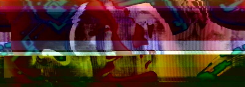 Imagen glicheada horzontalmente de dos personas a punto de besarse. La imagen tien tonos rojos, verdes, amarillos y azules.